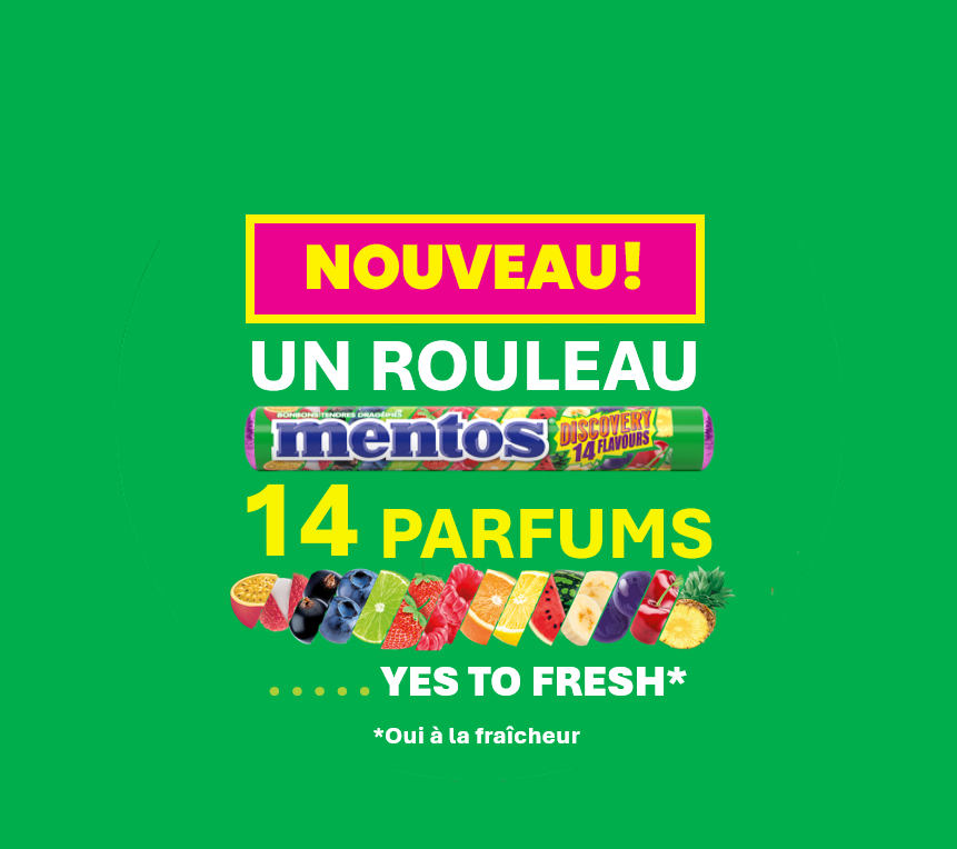 Découvrez les nouveaux bonbons Mentos Discovery 14 flavours! 14 goûts différents dans un seul et même rouleau : fruit de la passion, pastèque, cerise, ananas, litchi… Découvrez-les tous sans plus attendre!